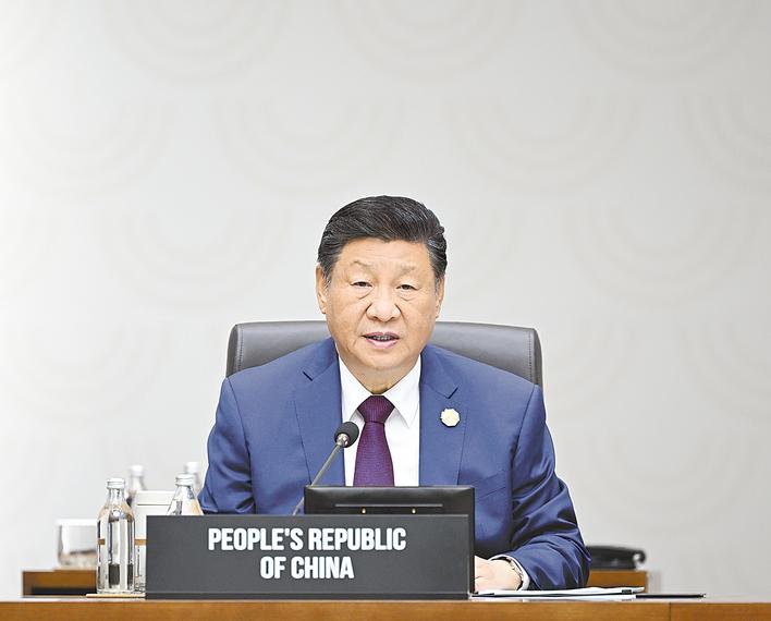 当地时间11月1日上午,国家主席习近平在韩国庆州出席亚太经合组织第三十二次领导人非正式会议第二阶段会议,并发表题为《共同开创可持续的美好明天》的重要讲话。(新华社发)