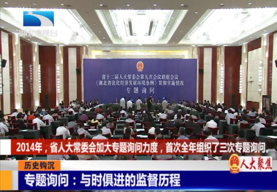 2014年,省人大常委会加大了专题询问的力度,首次全年组织了三次专题询问。涉及优化经济发展环境、湖泊保护和审计整改问题,3名分管副省长以及36个省直部门的负责人到场应询。十年间,湖北省人大常委会在专题询问工作中,紧紧围绕党中央重大决策部署和人民群众普遍关注的热点难点问题,如职业教育法律法规实施情况、聚焦湖泊保护、水污染防治,以及今年的优化营商环境等社会问题,开展专题询问。在实践中持续完善专题询问组织方式和工作机制,积极推进专题询问的规范化、机制化、常态化,不断提升专题询问工作水平和人大监督工作实效。有效推动解决一批实际问题,取得了实实在在的效果。