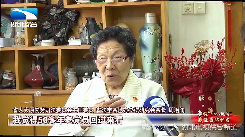 省人大原内务司法委员会主任委员 省法学会地方立法研究会会长 周冶陶:我觉得50多年老党员回过来看,现在就懂了说的那句话,什么叫真正的共产党员,那就是你要全心全意为人民服务,这就叫真正的共产党员,这是我的想法,像我们退了休以后,还能干一点力所能及的事,也不是为了钱、也不是为了名,就是还能做一点为老百姓服务的事情。