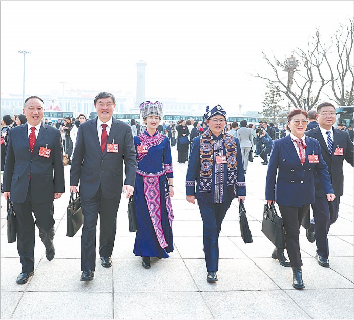 3月5日上午9时,十四届全国人大三次会议开幕。图为湖北代表团从北京饭店驻地出发前往人民大会堂,共赴这场春天的盛会。 (湖北日报全媒记者 李溪 摄)