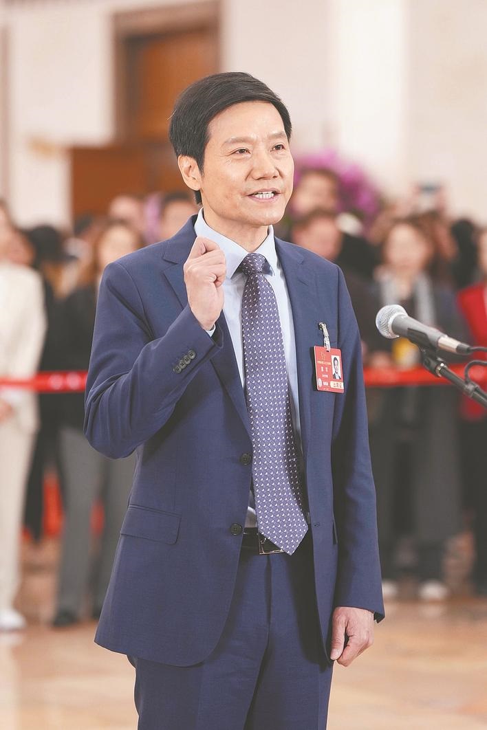 3月5日,第十四届全国人民代表大会第三次会议首场“代表通道”集中采访活动在北京人民大会堂举行。这是全国人大代表雷军接受媒体采访。(新华社发)