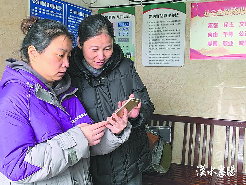 王莉(右)跟同事一起在手机上搜寻公厕信息。