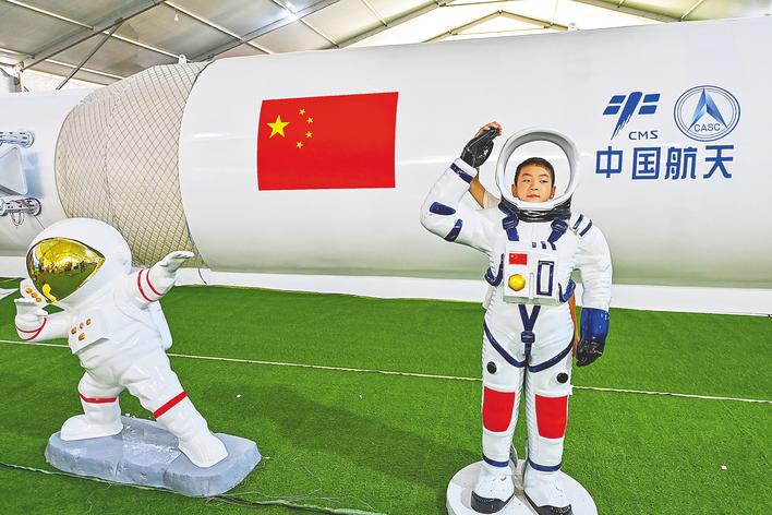 一名小学生在“国防之光·筑梦未来”航空航天国防教育军事科技展(武汉站)上拍照。(湖北日报全媒记者 朱熙勇 摄)