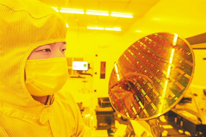九峰山实验室,科研人员正在检查芯片晶圆完整性。 (湖北日报全媒记者 魏铼 摄)