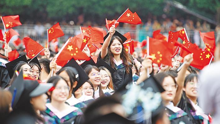 在武汉大学毕业典礼上,毕业生们挥舞着国旗齐聚一堂,定格毕业季最美的珞珈时光。(湖北日报全媒记者 何宇欣 摄)