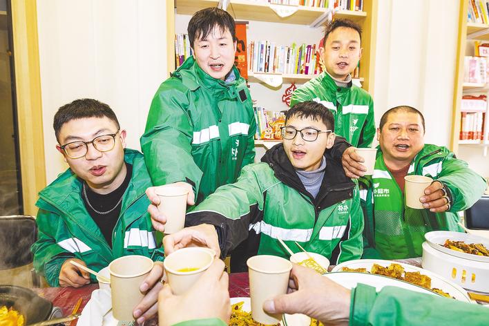 在武汉市武昌区户部巷社区服务驿站里,外卖小哥们围坐在一起,吃上了社区专门准备的团年饭。 (湖北日报全媒记者 何宇欣 通讯员 冯露敏 王书娴 摄)