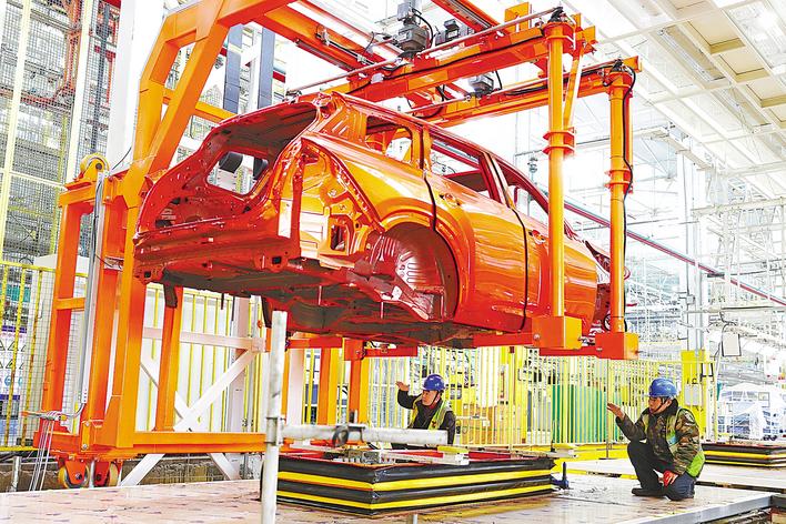 东风新能源智能越野车产业基地,机器轰鸣,焊花闪烁,工人们全力以赴开展产线改造。(视界网 王虎 摄)