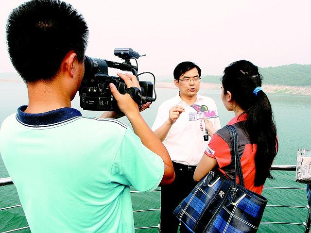 图为:湖北环保世纪行中,记者就丹江口水库水质情况采访当地有关负责人。