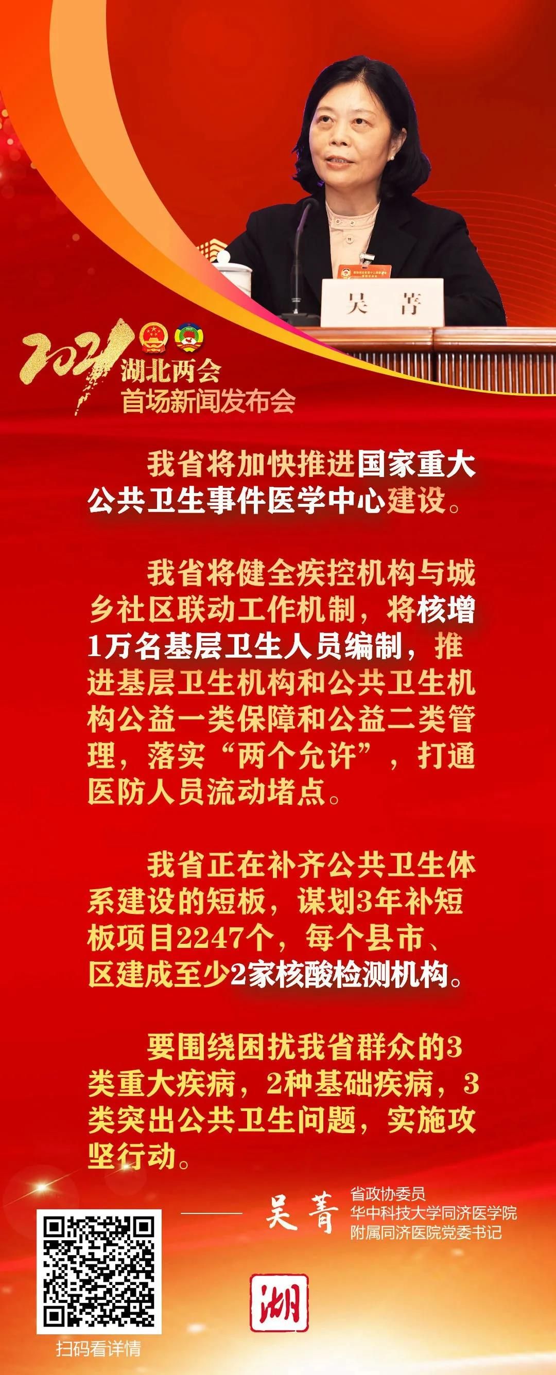 省政协委员、华中科技大学同济医学院附属同济医院党委书记吴菁表示,我省将加快推进国家重大公共卫生事件医学中心建设。