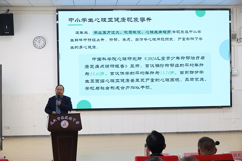 在研学分享环节,理论观点与实践经验的碰撞格外热烈。区人大社会委专家咨询组成员、武汉市粮道街中学书记向进率先作“用爱和责任守护青少年心理健康”的主题报告,从当前中小学生心理健康问题的类型、成因入手,结合教育实践提出“家庭筑牢情感防线、学校搭建专业平台、社会营造包容环境、专业力量提供科学支撑”的对策建议,为后续工作提供理论指引。