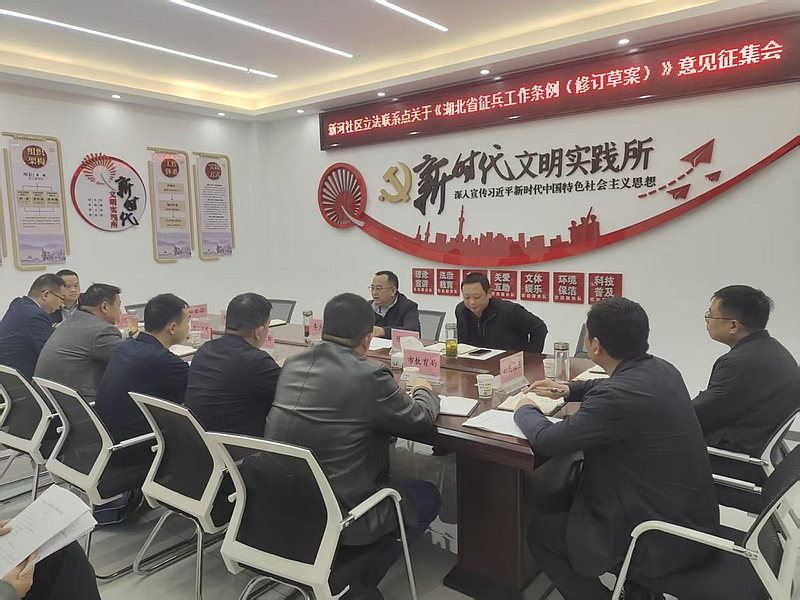 11月7日,应城市人大常委会党组成员李少楠带队,组织市人武部、退役军人事务局、人社局、卫健局等市直相关单位及部分乡镇,到省人大基层立法联系点应城市城中街道新河社区,召开《湖北省征兵工作条例(修订草案修改稿)》立法调研座谈会。
