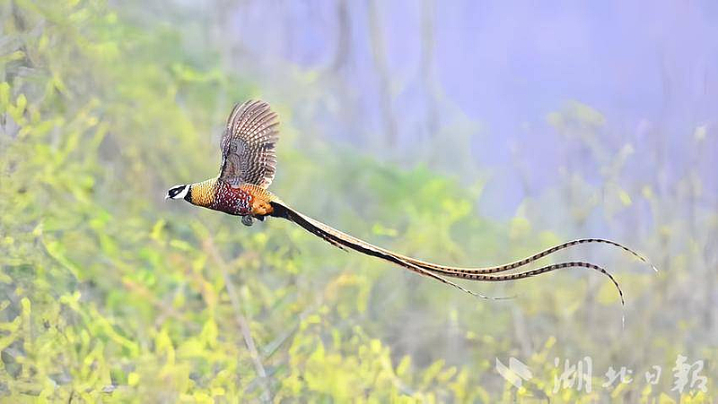 山水清秀如初,空气清新纯净,这一精灵如约而至。白冠长尾雉极其机敏,人们只得在相隔数百米远的地方,从镜头里观赏到物种多样性的可贵:周身色彩鲜艳丰富,尾羽修长而轻盈、美丽而坚韧,在当地被称作山间的“凤凰”。这种鸟对落脚和繁殖地有着极其严苛的要求,再次选择这里作为繁殖地,证明广水十多年的环保付出成效渐显。