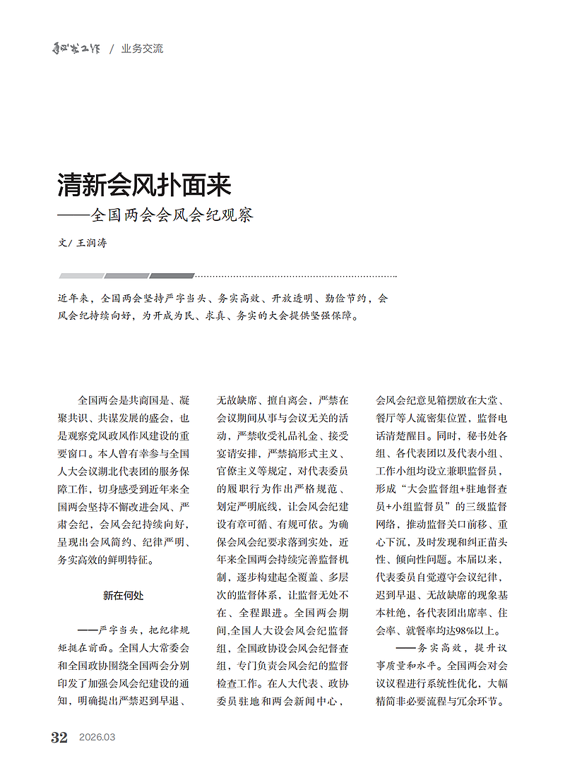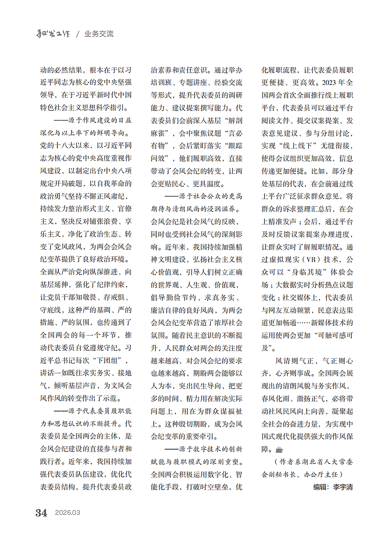 全国两会是共商国是、凝聚共识、共谋发展的盛会,也是观察党风政风作风建设的重要窗口。本人曾有幸参与全国人大会议湖北代表团的服务保障工作,切身感受到近年来全国两会坚持不懈改进会风、严肃会纪,会风会纪持续向好,呈现出会风简约、纪律严明、务实高效的鲜明特征。