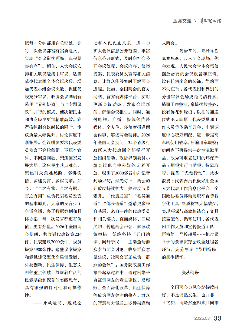全国两会对会议议程进行系统性优化,大幅精简非必要流程与冗余环节,把每一分钟都用在关键处,让每一次会议都富有实质意义,实现“会议衔接顺畅、流程紧凑有序”。例如,人大会议安排相关联议题集中审议,适当减少代表团全体会议次数,增加代表小组会议次数,保证代表充分审议,政协会议则创新采用“界别协商”与“专题议政”并行的模式,使决策民主和协商民主更加精准高效。在严格控制会议时长的同时,审议质量大幅提升、讨论深度不断拓展。会议明确要求代表委员发言不穿靴戴帽、不照本宣科、不回避问题,聚焦国家发展大局、聚焦民生热点难点、聚焦群众急难愁盼,多讲实情、多建良言、多献良策。如今,“言之有物、言之有据、言之有用”成为代表委员发言的基本原则,大家的发言少了空话套话,多了数据案例和具体方案,每一次发言更有价值、更有分量。2026年全国两会期间,共收到代表议案226件、意见建议7000余条,委员提案5900余件。这些议案提案和意见建议聚焦高质量发展、科技创新、民生保障、生态文明等重点领域,凝聚着广泛的民意基础和深刻的实践思考,具有很强的针对性和可操作性。