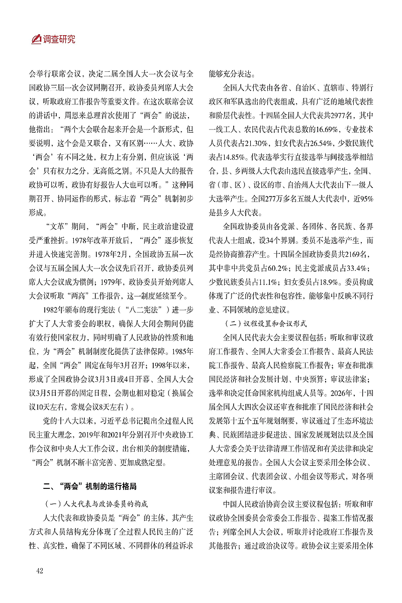 人大代表和政协委员是“两会”的主体,其产生方式和人员结构充分体现了全过程人民民主的广泛性、真实性,确保了不同区域、不同群体的利益诉求能够充分表达。