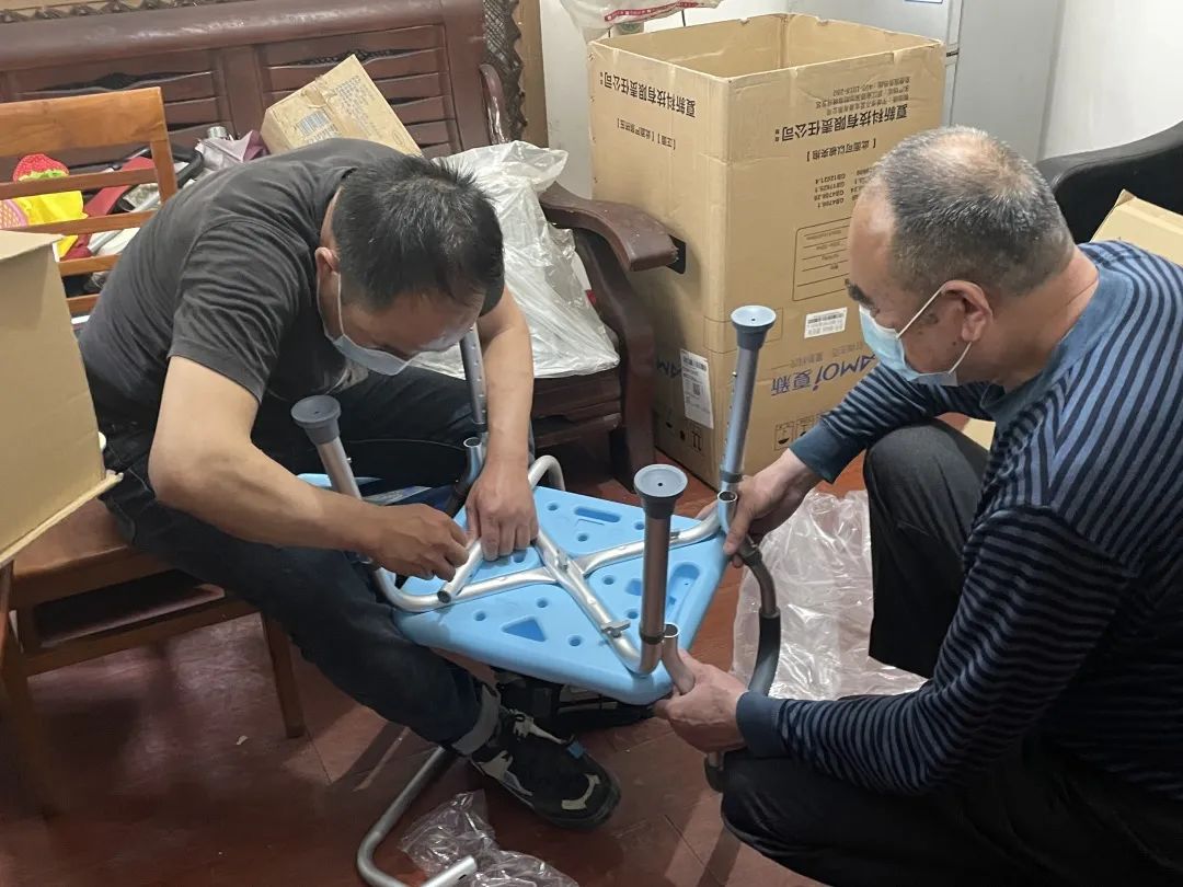 社区工作人员为失能老人安装适老化设备(辅助椅等)