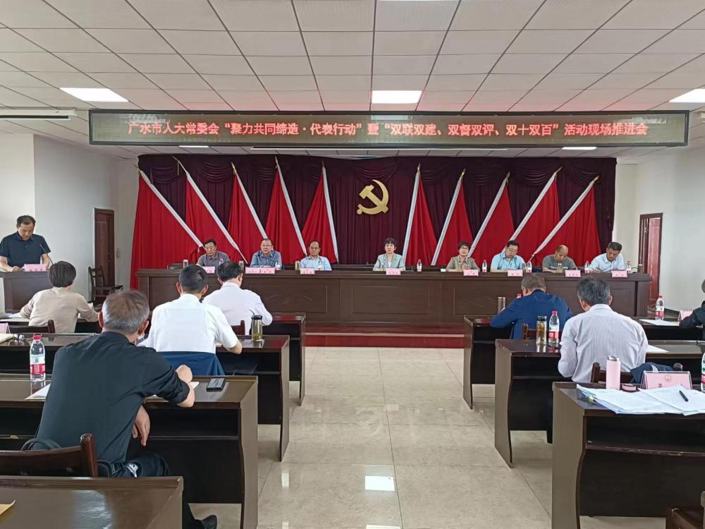 5月17日上午,广水市召开“聚力共同缔造·代表行动”暨“双联双建、双督双评、双十双百”活动现场推进会,总结回顾了过去一年全市代表行动取得的成效,安排部署下一阶段代表行动和“三双”工作。市人大常委会主任、副主任,市人大常委会各工委室主任,各镇办人大主席(工委主任)、开发区人大负责人参加了会议。