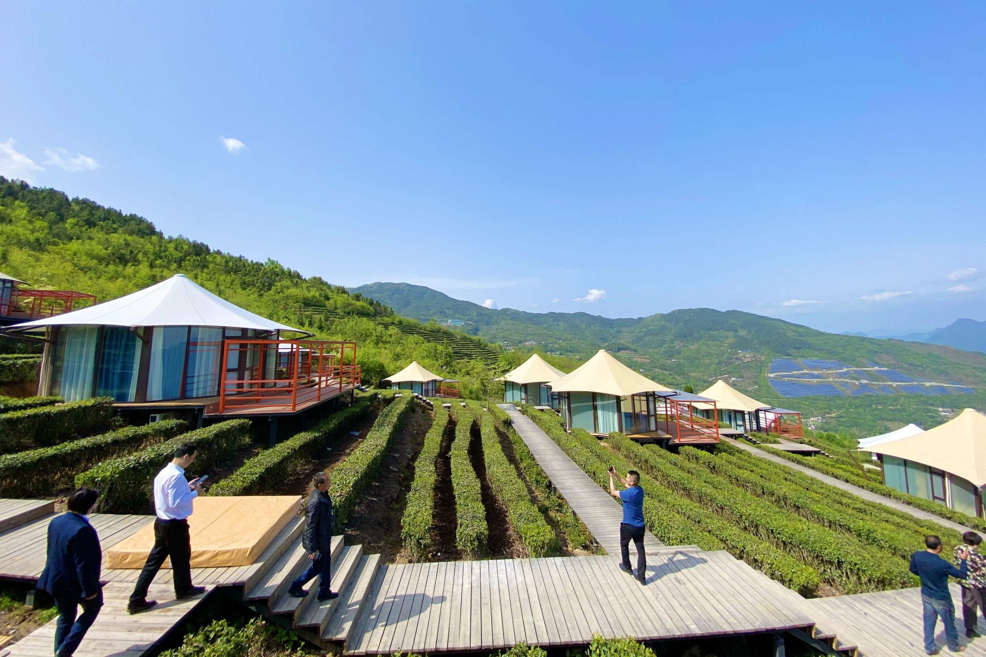 “游客不仅可以在苍郁挺拔的‘百年大杉树’景区下,品味昭君白茶,还可以枕着茶叶入住‘岩上茶居’帐篷全景酒店,闻着茶香醒来,如今已经吸引了一拨又一拨游客前来打卡预订。”6月1日,峡口镇人大代表、兴山县老岩岭观光农业开发有限公司董事长乔云明介绍道。放眼望去,岩岭村大杉树景点与万亩白茶园连点成线,正串起普安昭君白茶乡村振兴示范带,茶休闲、茶旅游、茶养生正悄然兴起.....