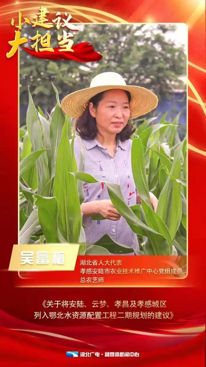 湖北省人大代表、孝感安陆市农业技术推广中心党组成员、总农艺师 吴富梅:“孝感长期受干旱缺水问题困扰,就拿安陆来说,每年供水、灌溉大概缺5000万方,群众用水存在水质不稳定(的问题),所以我就考虑,能不能建设分水口,把一定量的水引到安陆、孝昌(等地),让更多沿线群众受益。”