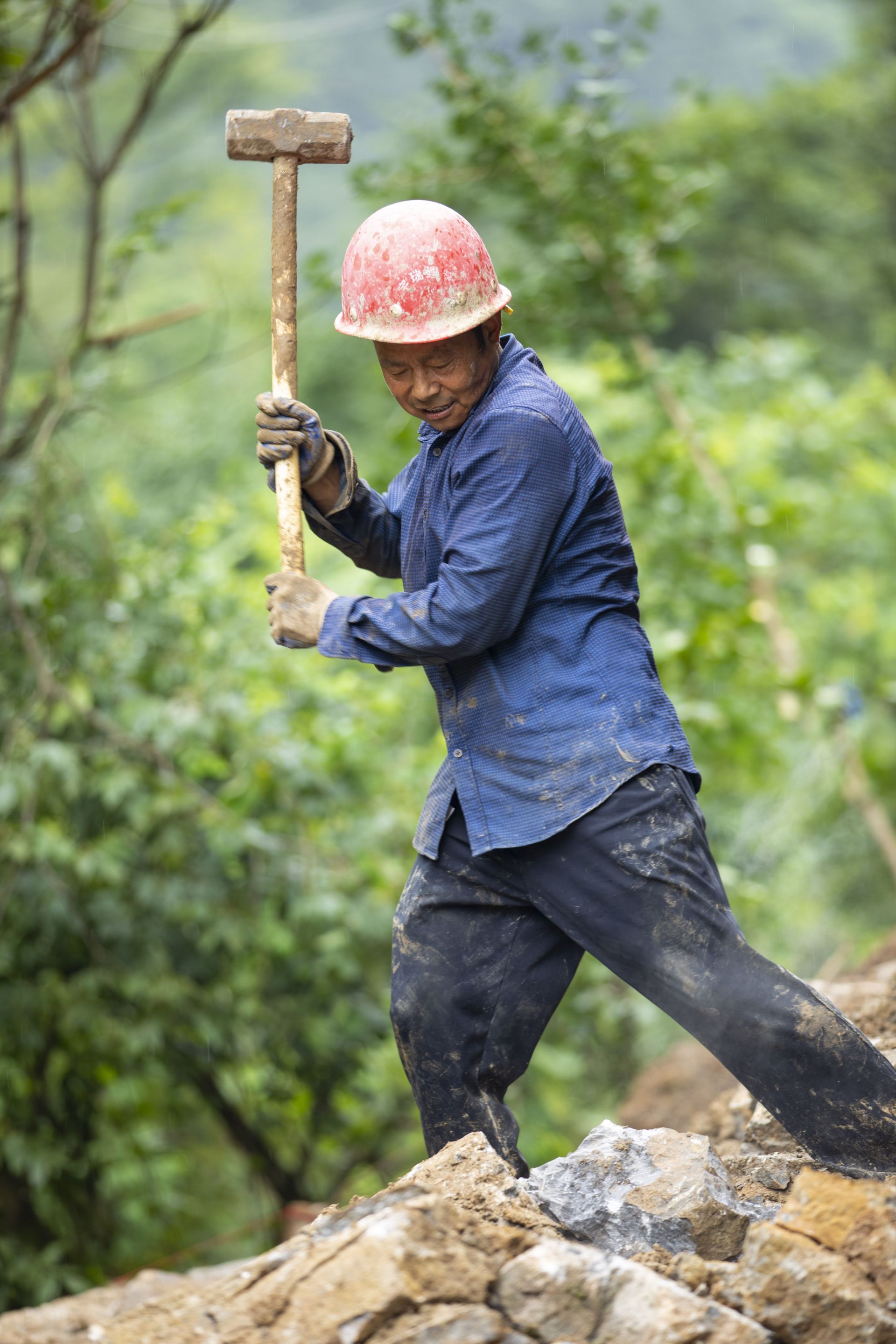 7月下旬的一天上午,淅淅沥沥的小雨下个不停。龚万祥弟弟龚万虎带路,记者来到金匾路施工现场,老远就听见铁锤与石头的碰撞声在山间回响,龚万祥正带领村民们在一台挖掘机的助力下冒雨施工砌培。