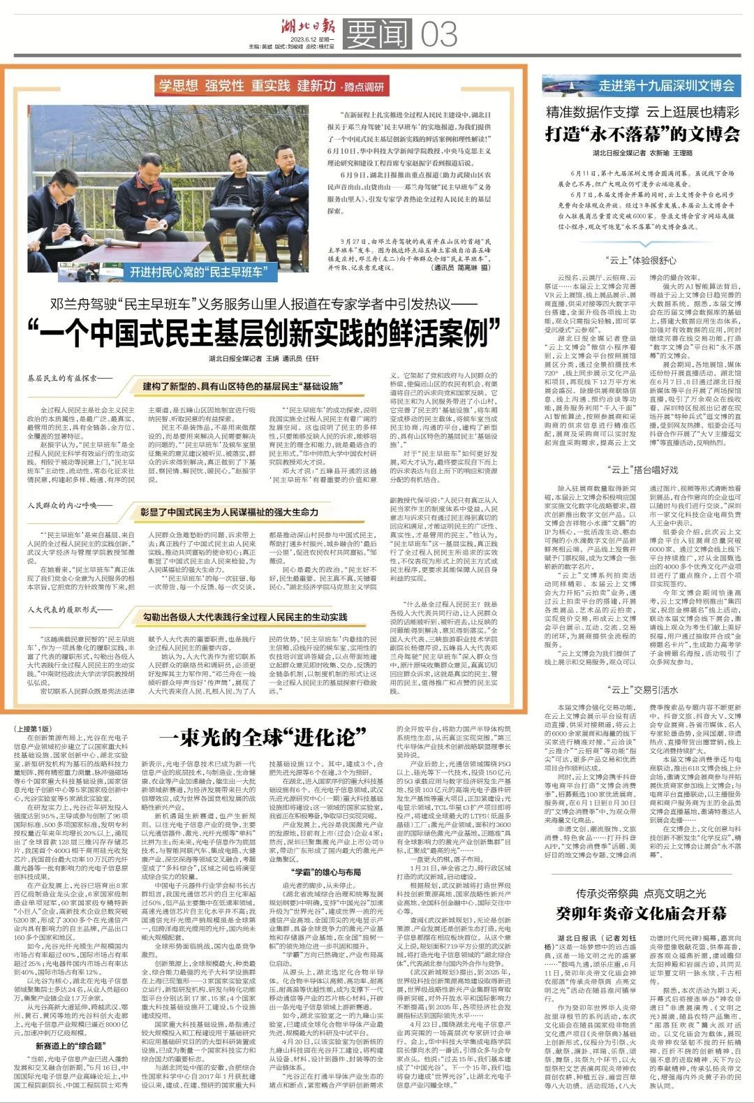 6月9日,湖北日报推出重点报道《助力武陵山区农民声音出山、山货出山——邓兰舟驾驶“民主早班车”义务服务山里人》,引发专家学者热论全过程人民民主的基层探索。