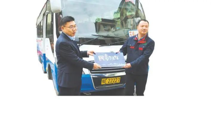 3月27日,以邓兰舟(右)爱心车队为依托,我省开在山区的首辆“民主早班车”正式授牌发车。 (通讯员 简高林 摄)