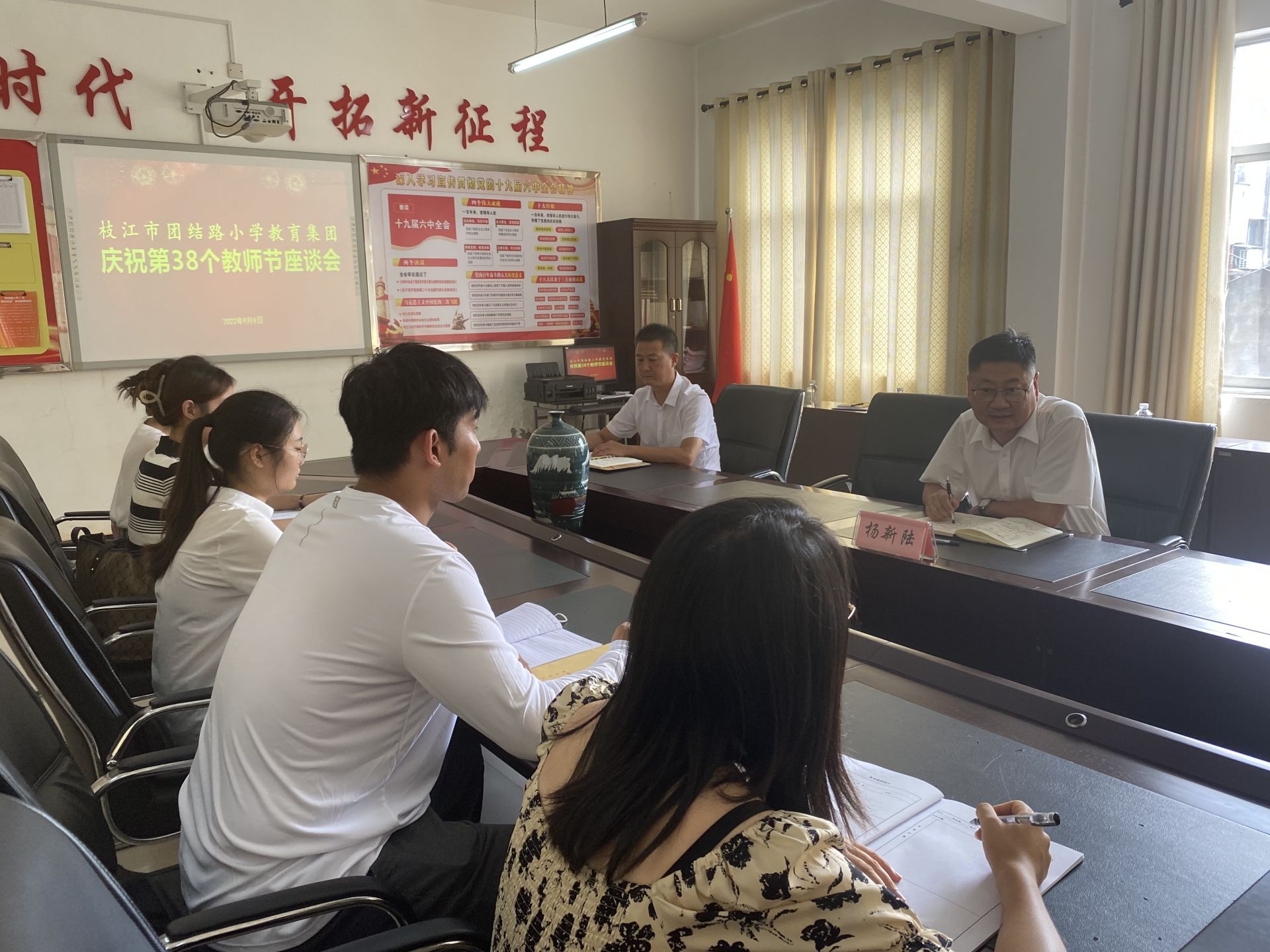 作为一校之长,杨新陆始终坚持教育为本,躬耕沃土育新苗。他勤学善思、严格自律,学科教研、日常考勤、光盘行动、垃圾分类、志愿服务……总是以身作则。