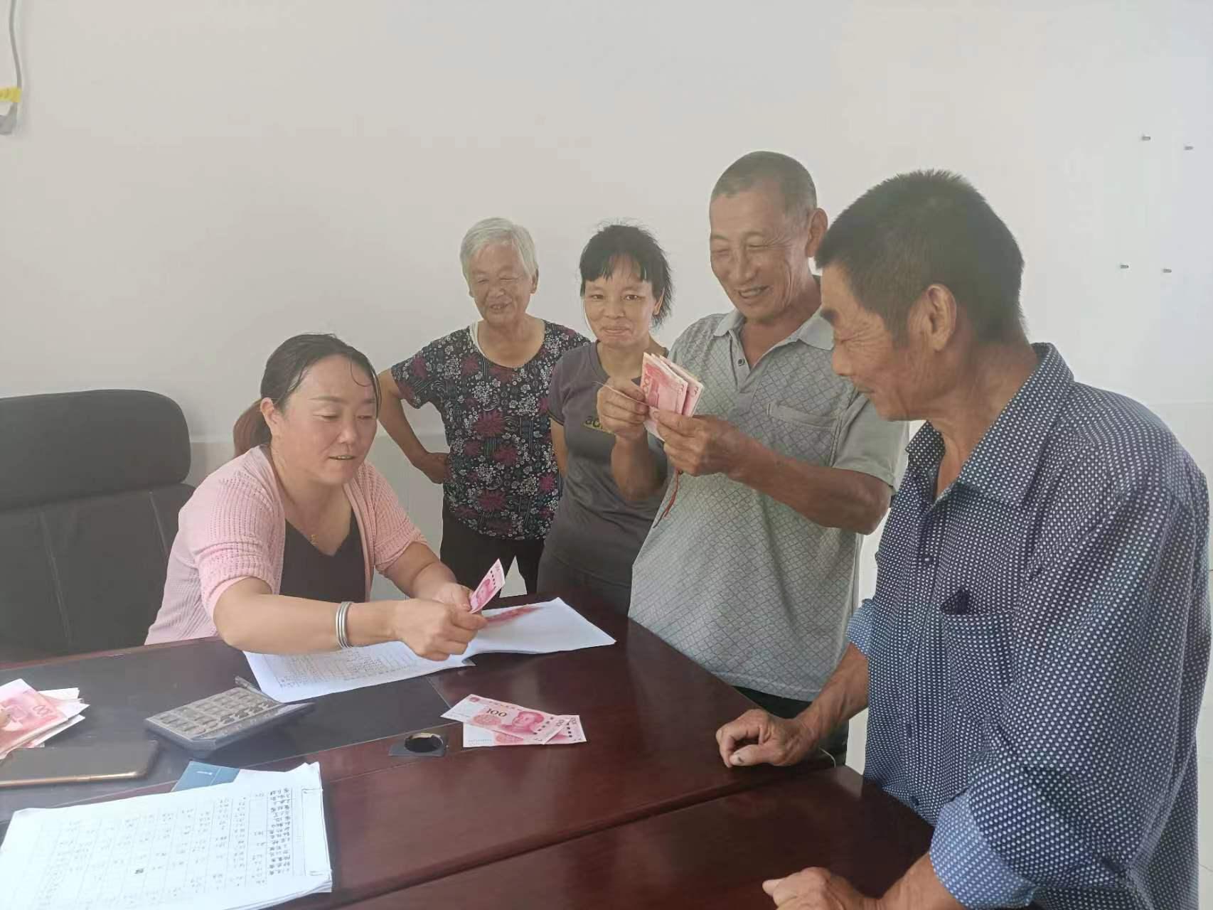 杨风梅(左一)合作社为务工农民发放工资