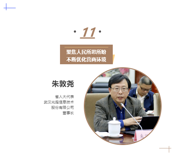 我来自高新技术企业的创业一线,2005年从日本回国创办光庭。回顾国外生活经历和国内创业经历,我深刻感受到人民代表大会制度的巨大优越性和强大生命力。在每一次企业的跃进中,都离不开省、市、区的“雪中送炭”,帮助企业解决制约性、突出性、关键性问题。光庭公司已成长为国内智能网联汽车软件的头部企业。今年公司员工规模已达到2000人,成为近100家国内外著名车厂和零部件的核心软件供应商。今天在湖北创业,可谓天时地利人和尽享。各级党委、政府和人大代表聚焦我们企业家的所思所盼所愿,不断优化营商环境,当好“店小二”,其本质就是不忘初心,时时刻刻坚持人民至上。作为这一领域的领军型企业和领军人才代表,我深感责任重大,要为湖北汽车板块的强大和高质量持续发展,义无反顾、勇往直前。