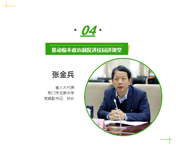我校努力让全过程人民民主与人民代表大会制度进校园、进思政课堂,邀请人大代表进校园,主动为荆门市人大代表龙泉小组提供活动场所。人大代表经常来校举办选民座谈会、节水宣传、宪法日等活动,传播人大声音,讲好人大故事。充分利用“一网一微一栏一报”等自有平台,大力宣传宪法以及人民代表大会制度相关知识、人大代表履职的典型事例。用好育人主阵地,将人民代表大会制度作为专题学习内容列入思政课,充分发挥思政课程政治引领和价值引领作用。引导、组织年满18岁的青年学生参加选区内人大代表换届选举,体验人民当家作主的幸福感。