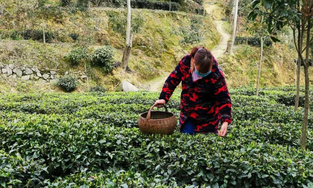 清晨,茶农们拎着竹篓到茶园采茶,和往年不同的是,他们一个个戴着口罩,零星分散在茶丛之间,双手灵活地在茶芽间飞舞。