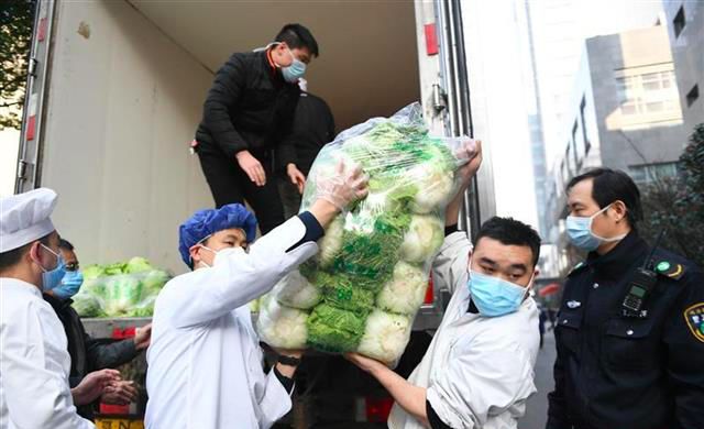2月3日中午,五辆满载30吨调味小龙虾、7万枚鸡蛋和2万斤白菜的冷藏车驶出潜江市莱克集团,奔向江城武汉。为了确保食材的新鲜,莱克集团连夜组织调味小龙虾、鸡蛋货源,一大早组织了20多人,到318国道旁的高场办事处联丰村蔬菜基地收割带霜的白菜。