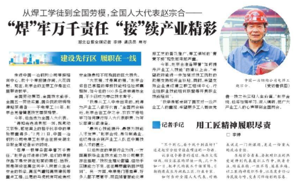“得知当选消息那一刻,既激动又紧张,感觉肩上的担子比手中的焊枪要重得多。”2月21日,中国一冶钢构公司电焊工赵宗合在接受湖北日报全媒记者采访时说。