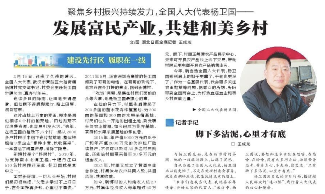 今年,新当选全国人大代表,杨卫国感到肩上的担子更重了,干劲也更足了。“作为一名基层代表,我会更多关注农田抛荒等问题,把群众的所想、所盼带到全国两会上,为打造宜居宜业和美乡村贡献力量。”