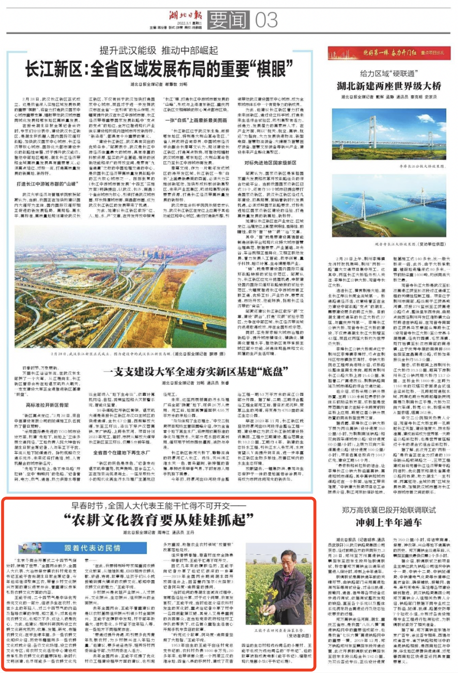 2022年全国两会召开在即,今年是本届全国人大代表履职的最后一年。5年来,住鄂全国人大代表深入基层一线,开展走访调研,倾听百姓心声,积极建言资政,充分展现了代表的责任担当。他们关注哪些领域?又有什么新期盼新打算?今天,《湖北日报》03版《跟着代表访民情》专栏,讲述全国人大代表王能干的履职故事。