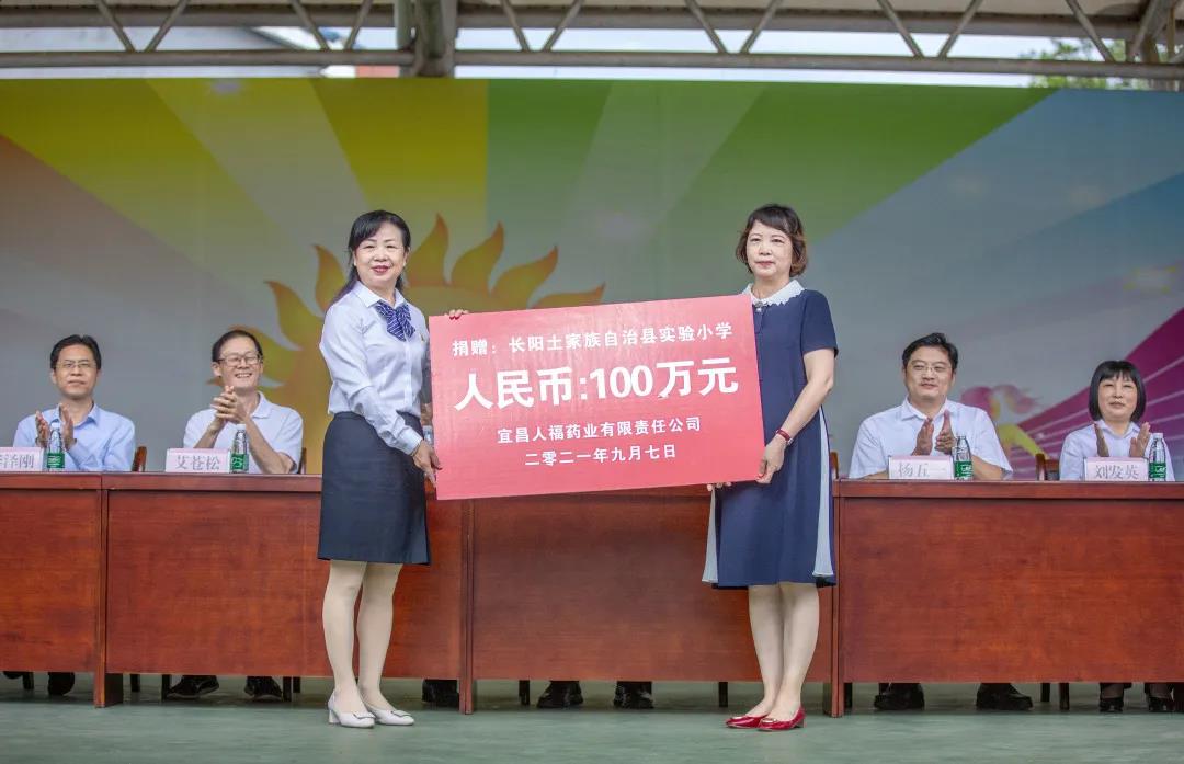 9月7日,宜昌人福药业有限责任公司向长阳土家族自治县实验小学捐赠慈善助学金100万元。