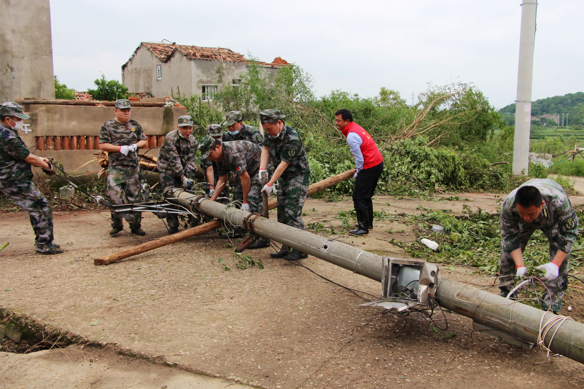 “来!大家一起把树杈搬开,把路面上的枝桠清理干净,免得影响车辆安全通行。”区人大代表、永安街炉房村党总支书记杨军带领村干部和村民一起动手,把倒在景观大道上的多棵大树移到安全地方。龙卷风刚一停歇,杨军就组织大家完成了全村道路的清理,保证了相关救援机械快速高效地开展灾后救援工作。