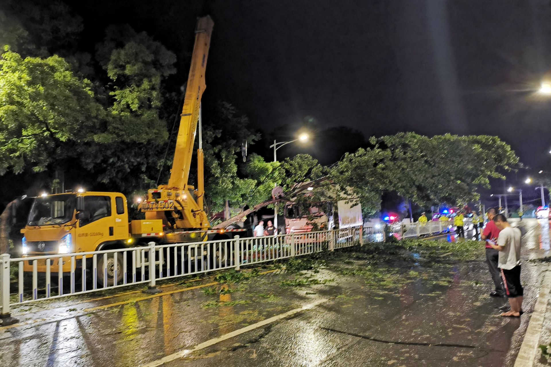 在奓山街长新村附近,S104省道上有两颗大树被吹倒,砸中一辆行驶中的货车。接到消息后,区人大代表、永安街党工委书记计文华组织力量第一时间赶往现场,解救司机,迅速调集吊车、电锯等专业救援设备入场除障,连续工作到次日凌晨1点多钟,先后完成车辆救援、倒塌树木清理工作,确保了重要道路的安全畅通。