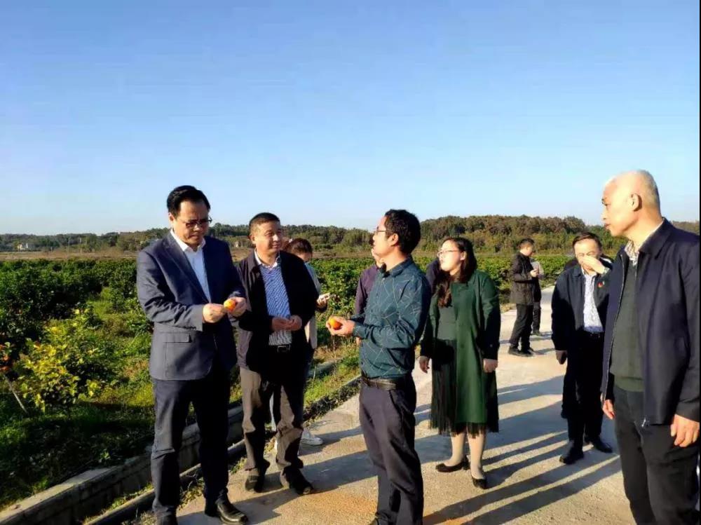 图 | 全国人大代表于清明(左一)和市人大代表、区长张斐(左二)在佰果冠公司砂糖橘基地。