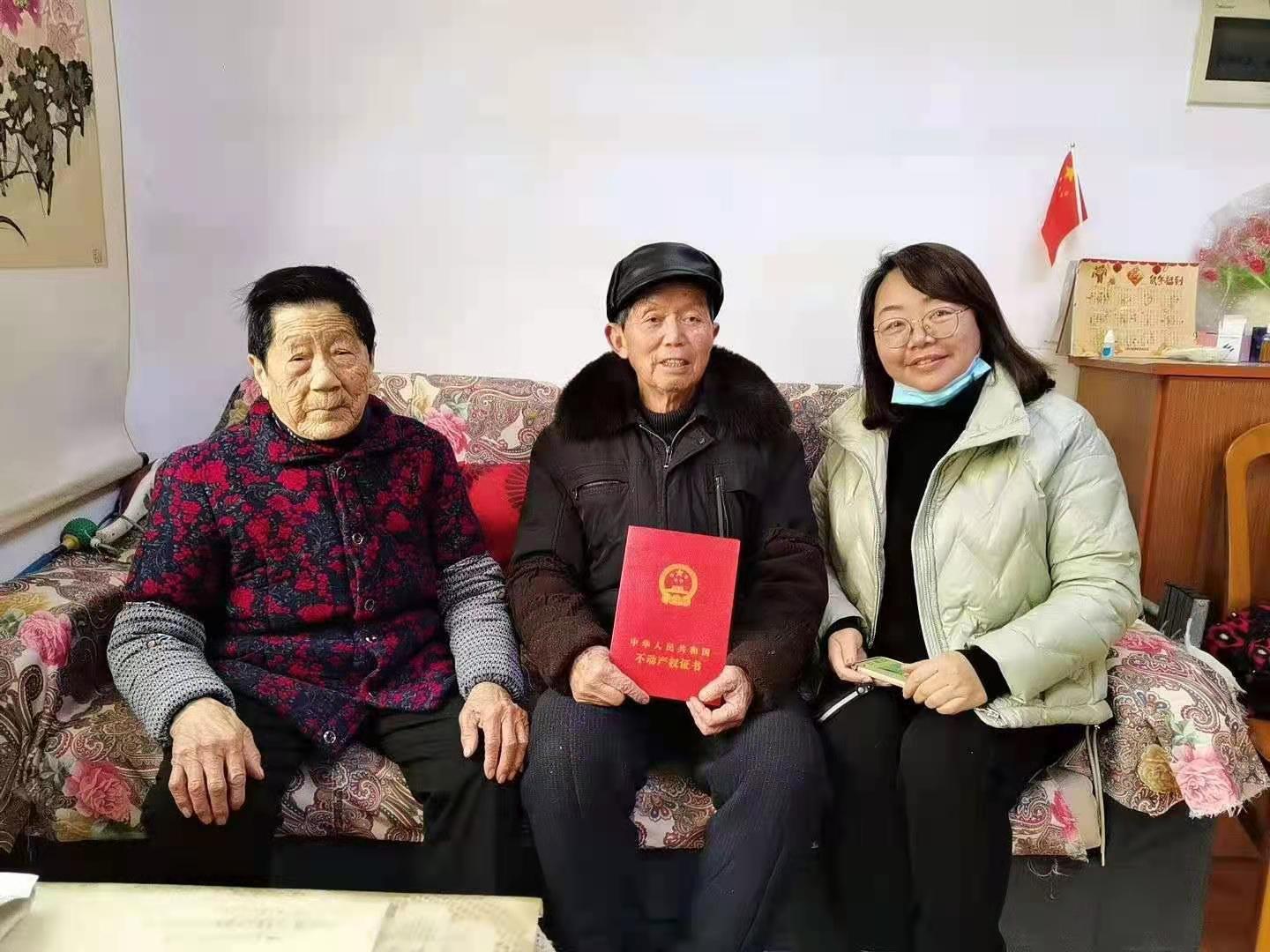 近日,江花社区九旬居民黄忠汉(中)在家收到社区副书记钱琼送来的刚办好的不动产权证。 江花社区供图