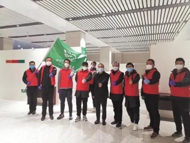 2月22日,在汉口北方舱医院改造现场,卓尔控股董事长阎志(右五)为企业志愿者加油