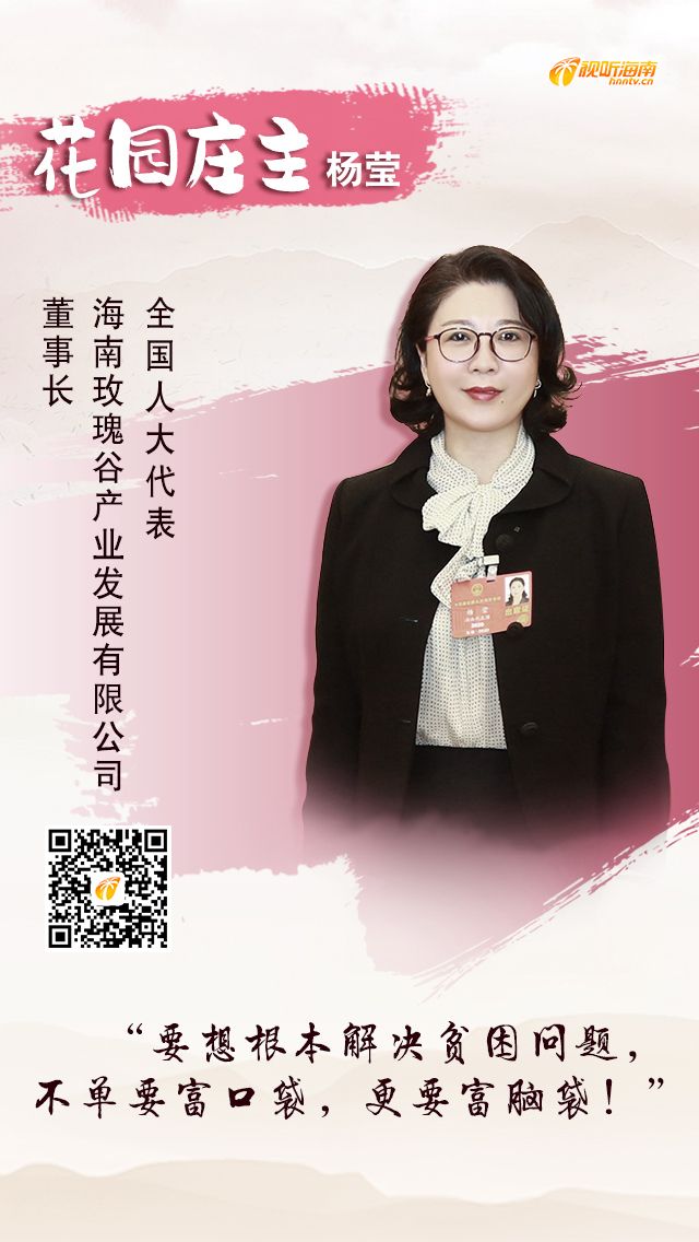 她是“花园庄主”:创办玫瑰谷、发展玫瑰产业,一腔热情倾注花田,用大自然的缤纷色彩为海南增添一抹亮色,也解决了周边数千名农户的就业问题。绿水青山就是金山银山,两会上她提议,“试点建设一批‘花园小镇’、‘花园村庄’,改善农村人居环境,提升乡村旅游质量。”