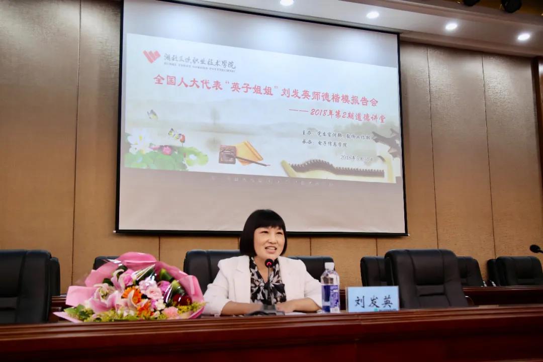 2018年6月19日,刘发英在湖北三峡职业技术学院作师德报告。(刘发英供图)