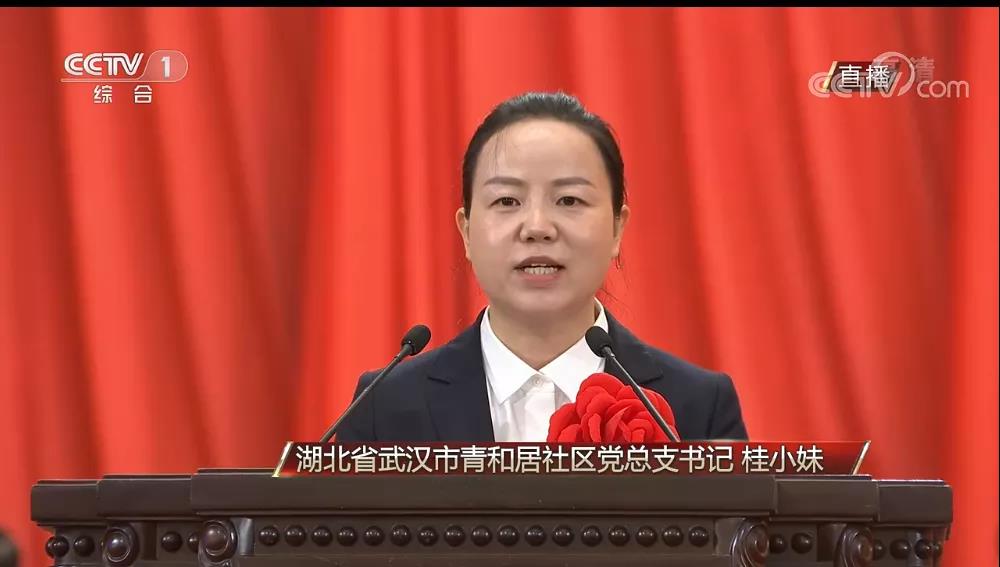 全国抗击新冠肺炎疫情先进集体、全国先进基层党组织代表,武汉市人大代表、湖北省武汉市青和居社区党总支书记、主任桂小妹走上表彰大会的发言席,讲述了青和居社区及武汉人民的战疫故事。