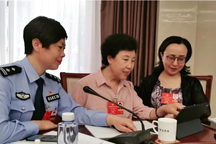 十三届全国人大三次会议期间,全国人大代表郭凤莲(左二)和山西代表团代表们在会议间隙就准备提交的建议进行交流。(郭凤莲供图)