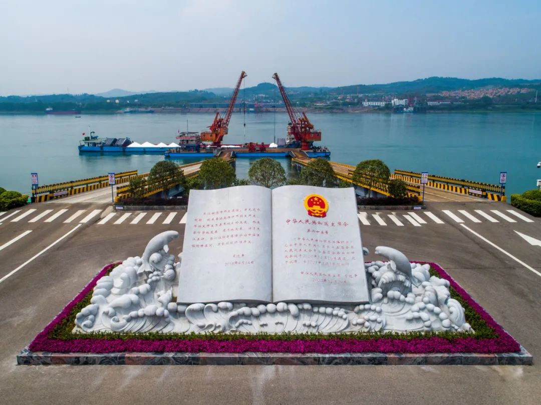 雕塑一边刻录着2018年4月24日,习近平总书记考察兴发集团作出的重要指示要求;一边记载着2020年12月26日,习近平主席签署第六十五号主席令,公布长江保护法通过和施行的情况。