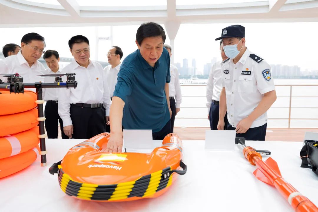 7月3日上午,栗战书委员长和检查组成员在武汉市汉口江滩码头,考察长江大保护工作情况。摄影/新华社记者 黄敬文