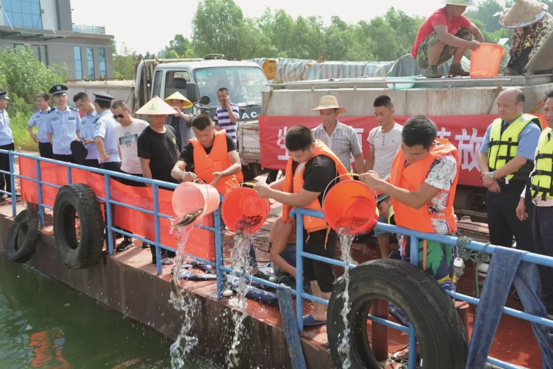今年6月14日,在长江涴市码头上,湖北省松滋市渔政、水政、海事等部门在该市人大、政协、检察院、新闻媒体及广大群众的监督下,举办“打击非法捕捞,修复长江生态”活动。此前因非法捕捞水产品罪被刑事处罚的唐某现场共放流成鱼132.6千克、幼鱼3.2万余尾。