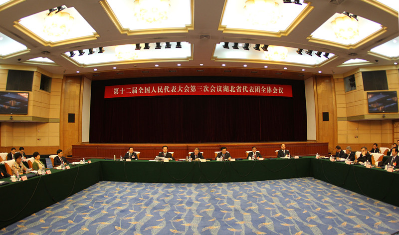 出席十二届全国人大三次会议的湖北代表团共有代表115名。代表团全体会议推选李鸿忠为湖北代表团团长,王国生、罗清泉、李春明、苏晓云、王晓东、周洪宇为代表团副团长。