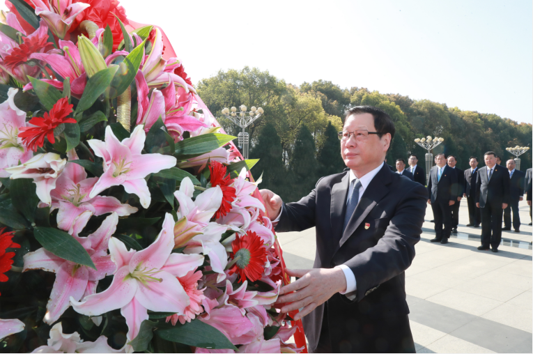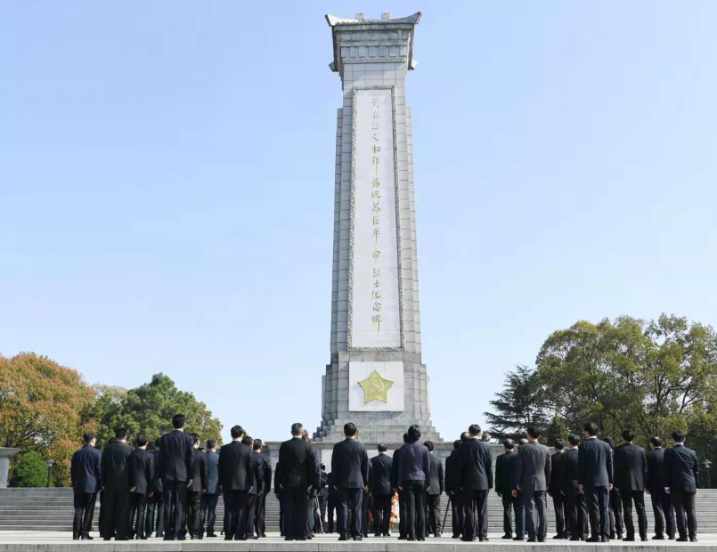 纪念碑前摆放着大型花篮,花篮红色缎带上写着“革命先烈永垂不朽”8个金色大字。美丽的鲜花寄托着深深的思念,承载着对先烈的崇高敬意。应勇缓步走上前,仔细整理花篮缎带。